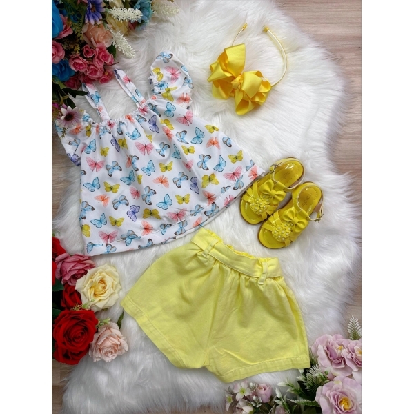 Conjunto Infantil Blusa Borboletas e Short Amarelo