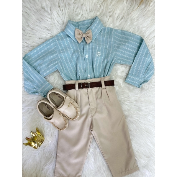 Informações do produto: Conjunto Infantil Camisa Listrada Verde e Calça Bege Cinto