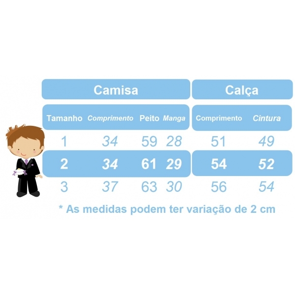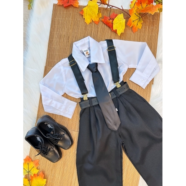 * Conjunto social infantil. Camisa em poliéster. Calça, suspensório e gravatinha em algodão. Calça com elástico nas costas. Suspensório removível.