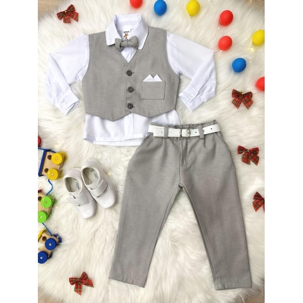 Informações do produto: Conjunto Social Camisa Branca e Colete Calça Gravata Cinza