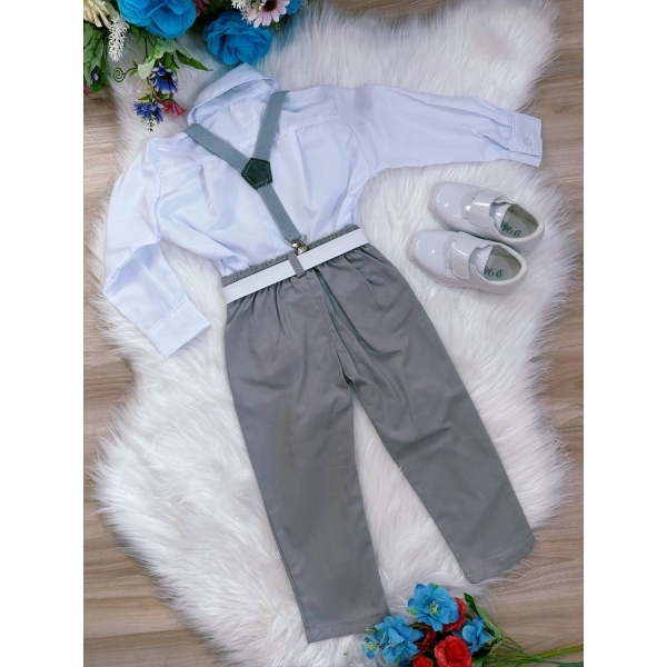 Conjunto Social Camisa Branca Susp. Gravata e Calça Cinza