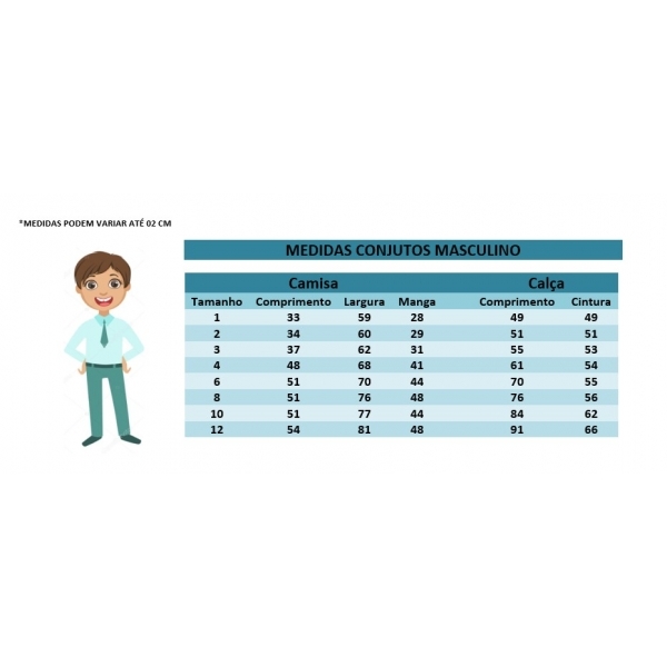 * Conjunto social infantil. Camisa em poliéster. Calça, suspensório e gravatinha em algodão. Calça com elástico nas costas. Suspensório removível.