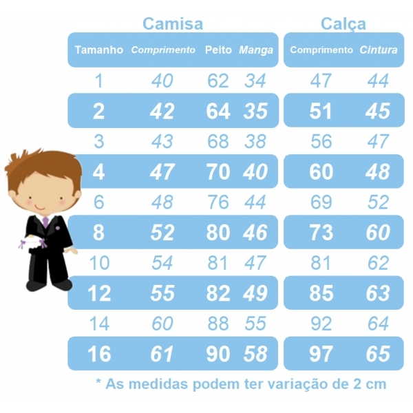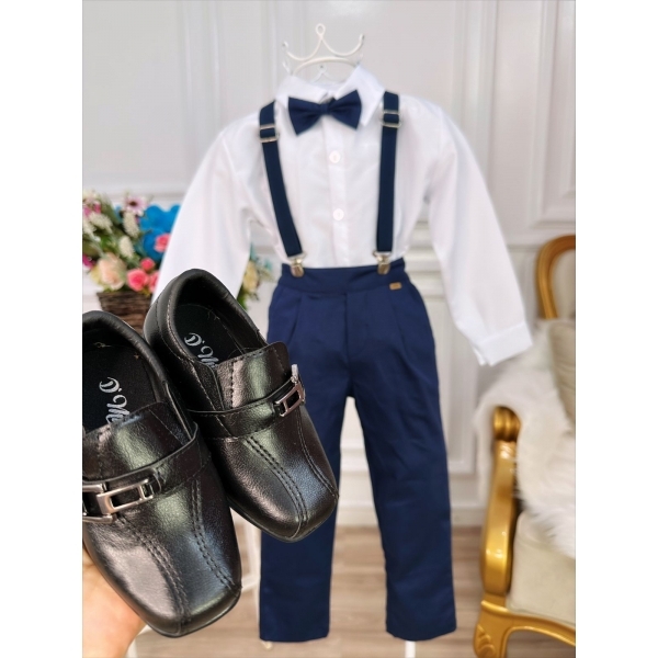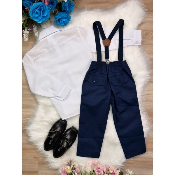 * Conjunto social infantil. Camisa em poliéster. Calça e gravatinha em algodão. Calça com elástico nas costas. Suspensório removível.