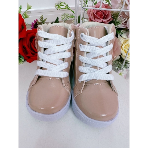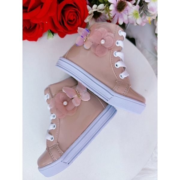 Informações do produto: Coturno Infantil Nude Verniz C/ Cadarço Florzinha Borboleta