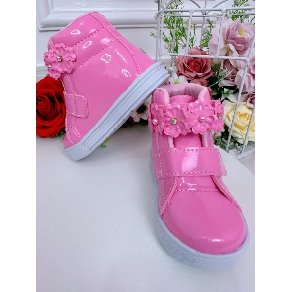 Informações do produto: Coturno Infantil Rosa Chiclete Verniz C/ Velcro e Florzinhas