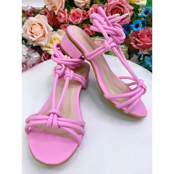 * Sandália infantil de amarrar em courino, com salto e tiras coloridas.