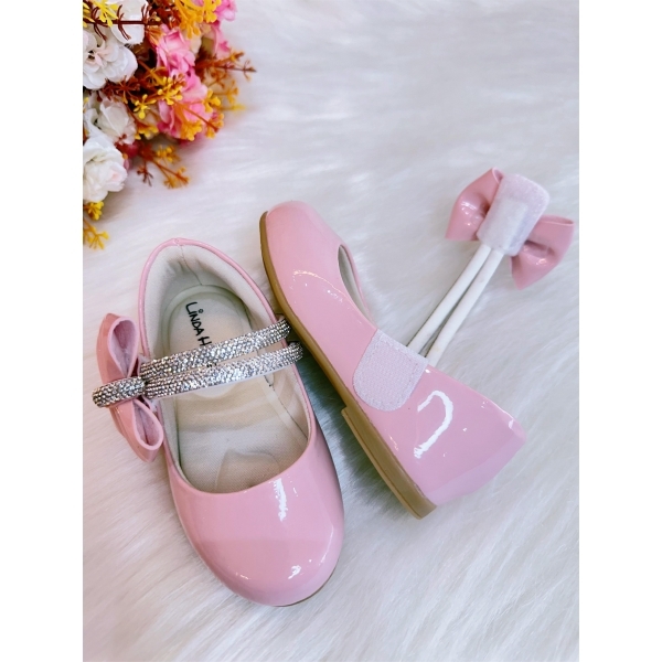 * Sapatinho infantil na Cor Rosa Claro Verniz, Aplique de Lacinho e Tiras com Strass Luxo!
