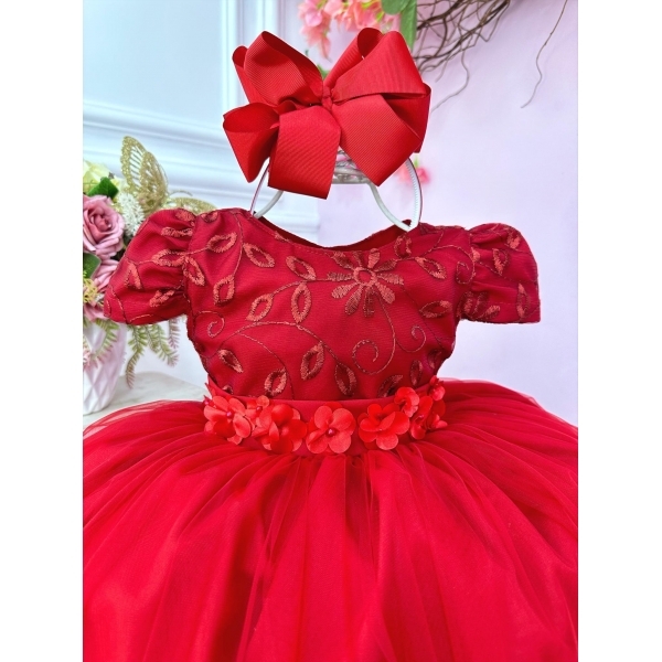 Vestido Infantil Vermelho C/ Renda e Aplique de Flores Festa - Vermelho