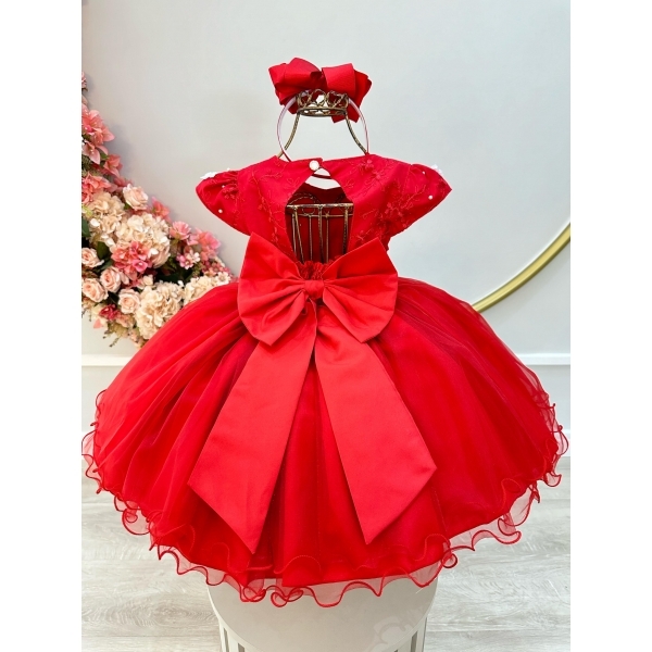 Vestido Infantil Vermelho Renda Aplique Flores Borboletas