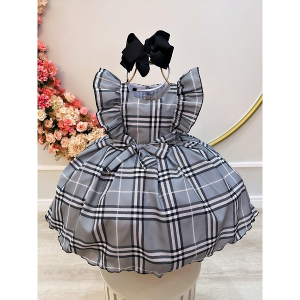 Vestido Infantil Xadrez Cinza Tartan Festas Luxo